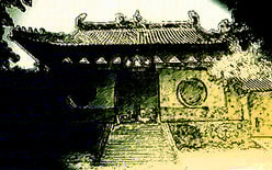 La porte du temple de Shaolin, situé dans la province chinoise du He Nan, au centre de la Chine. Ce temple est considéré comme le berceau des arts martiaux chinois, lesquels ont influencé le karaté d'Okinawa. C'est en 495 de notre ère que l'empereur Hsiao-Wen le fit construire.
